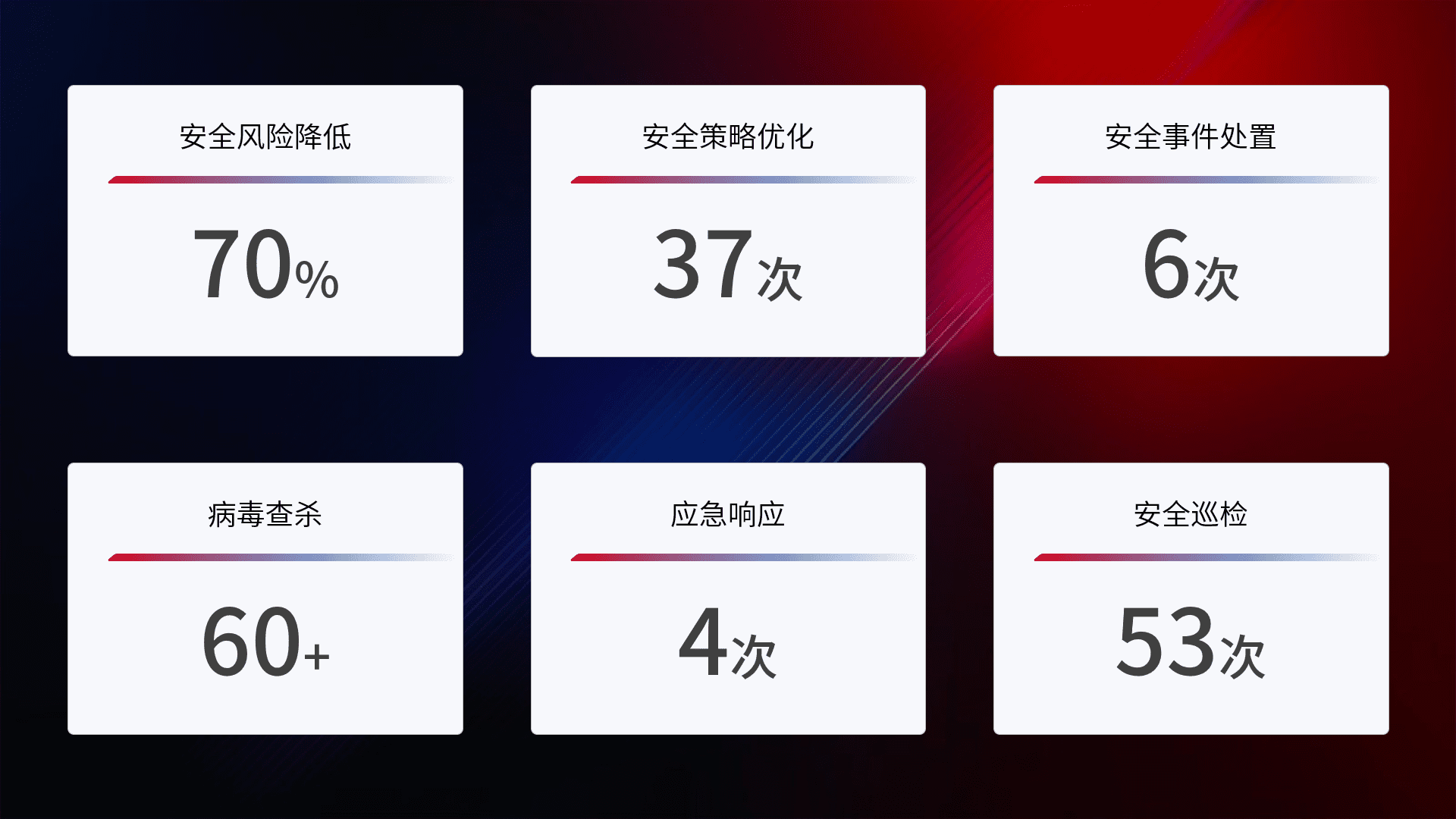 综合报告与文档服务: 定期提供安全事件处置报告、、周/季度总结报告和年度总结报告;详尽的文档服务可帮助客户了解网络安全状况,,,,支持决策制定和流程优化。。
